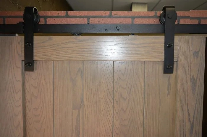 Двухколесный механизм открытого типа с ограничителями хода и креплением каретки с фасадной стороны дверного полотна.